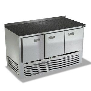 1485х700х850мм, Охлаждаемый стол с бортом высотой 50мм, нижнее расположение агрегата. Столешница камень толщиной 20мм, корпус из нержавеющей стали марки AISI 430. Задняя панель и дно из оцинкованной стали. 3 двери. Температурный режим -2...+10, напряжение 220В, мощность 220Вт, внутренний объем стола 340л, полезный объем стола 210л. Компрессор (Испания). Хладон R-134. Петля доводчик (Польша). Полка решетка регулируемая по высоте с шагом - 45мм, гастронормированная, нагрузка 35кг. Нога опорная, регулировка 25мм. Поставляется в собранном виде.