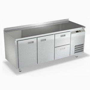 1835х600х850мм, Охлаждаемый стол с бортом высотой 50мм, боковое расположение агрегата. Столешница и корпус из нержавеющей стали марки AISI 430. Задняя панель и дно из оцинкованной стали. 2 двери, 2 ящика гастронормированных нагрузка по 35кг на ящик, направляющие с доводчиками (Австрия). Температурный режим -2...+10, напряжение 220В, мощность 460Вт, внутренний объем стола 420л, полезный объем стола 277л. Компрессор (Испания). Хладон R-134. Петля доводчик (Польша). Полка решетка регулируемая по высоте с шагом - 45мм, гастронормированная, нагрузка 35кг. Нога опорная круглая, регулировка 50мм (Италия). Поставляется в собранном виде.