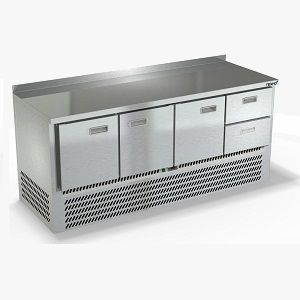 1970х600х850мм, Охлаждаемый стол с бортом высотой 50мм, нижнее расположение агрегата. Столешница и корпус из нержавеющей стали марки AISI 430. Задняя панель и дно из оцинкованной стали. 3 двери, 2 ящика гастронормированных нагрузка по 35кг, направляющие с доводчиками (Австрия). Температурный режим -2...+10, напряжение 220В, мощность 460Вт, внутренний объем стола 410л, полезный объем стола 202л. Компрессор (Испания). Хладон R-134. Петля доводчик (Польша). Полка решетка регулируемая по высоте с шагом - 45мм, гастронормированная, нагрузка 35кг. Нога опорная, регулировка 25мм. Поставляется в собранном виде.