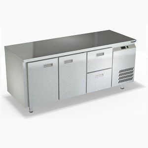 1835х600х850мм, Охлаждаемый стол без борта, боковое расположение агрегата. Столешница и корпус из нержавеющей стали марки AISI 430. Задняя панель и дно из оцинкованной стали. 2 двери, 2 ящика гастронормированных нагрузка по 35кг на ящик, направляющие с доводчиками (Австрия). Температурный режим -2...+10, напряжение 220В, мощность 460Вт, внутренний объем стола 420л, полезный объем стола 277л. Компрессор (Испания). Хладон R-134. Петля доводчик (Польша). Полка решетка регулируемая по высоте с шагом - 45мм, гастронормированная, нагрузка 35кг. Нога опорная круглая, регулировка 50мм (Италия). Поставляется в собранном виде.