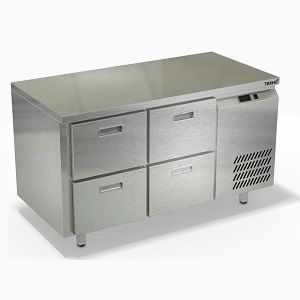 1390х600х850мм, Охлаждаемый стол без борта, боковое расположение агрегата. Столешница и корпус из нержавеющей стали марки AISI 430. Задняя панель и дно из оцинкованной стали. 4 ящика гастронормированных нагрузка по 35кг на ящик, направляющие с доводчиками (Австрия). Температурный режим -2...+10, напряжение 220В, мощность 220Вт, внутренний объем стола 224л, полезный объем стола 110л. Компрессор (Испания). Хладон R-134. Нога опорная круглая, регулировка 50мм (Италия). Поставляется в собранном виде.