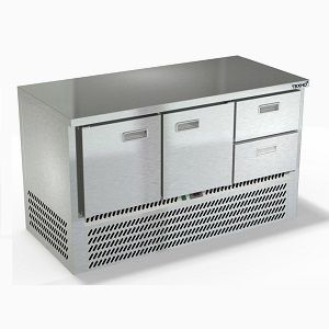 1485х700х850мм, Охлаждаемый стол без борта, нижнее расположение агрегата. Столешница и корпус из нержавеющей стали марки AISI 430. Задняя панель и дно из оцинкованной стали. 2 двери, 2 ящика гастронормированных нагрузка по 35кг, направляющие с доводчиками (Австрия). Температурный режим -2...+10, напряжение 220В, мощность 220Вт, внутренний объем стола 340л, полезный объем стола 179л. Компрессор (Испания). Хладон R-134. Петля доводчик (Польша). Полка решетка регулируемая по высоте с шагом - 45мм, гастронормированная, нагрузка 35кг. Нога опорная, регулировка 25мм. Поставляется в собранном виде.