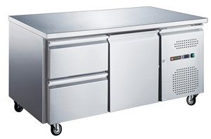 1360x700x850 мм, 230В, 0,215 кВт, 282 л, -2…+8 С, 1 дверь, 2 ящика, полка GN1/1, одна полка в комплекте, столешница из нержавеющей стали, без борта, боковое расположение холодильного агрегата, динамическое охлаждение, на колесах