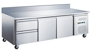 1795x700x950 мм, 230В, 0,23 кВт, 417 л, -2…+8 С, 2 двери, полки GN1/1, одна полка для каждой двери в комплекте, 2 ящика, столешница из нержавеющей стали, с бортом, боковое расположение холодильного агрегата, динамическое охлаждение, на колесах