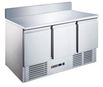 1365x700x976 мм, 230В, 0,24 кВт, 368 л, +2…+8 С, 3 двери, полки GN1/1, одна полка для каждой двери в комплекте, столешница из нержавеющей стали, с бортом, нижнее расположение холодильного агрегата, вентилируемое охлаждение