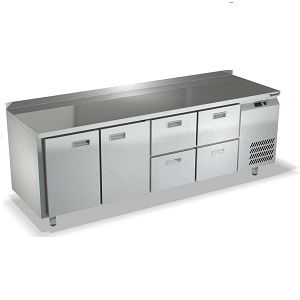 2280х700х850мм, Морозильный стол с бортом высотой 50мм, боковое расположение агрегата. Столешница и корпус из нержавеющей стали марки AISI 430. Задняя панель и дно из оцинкованной стали. 2 двери, 4 ящика гастронормированных нагрузка по 35кг на ящик, направляющие с доводчиками (Австрия). Температурный режим -10...-18, напряжение 220В, мощность 480Вт, внутренний объем стола 660л, полезный объем стола 374л. Компрессор (Испания). Хладон R404. Петля доводчик (Польша). Полка решетка регулируемая по высоте с шагом - 45мм, гастронормированная, нагрузка 35кг. Нога опорная круглая, регулировка 50мм (Италия). Поставляется в собранном виде.