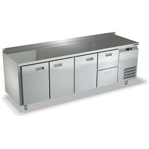 2280х600х850мм, Морозильный стол с бортом высотой 50мм, боковое расположение агрегата. Столешница и корпус из нержавеющей стали марки AISI 430. Задняя панель и дно из оцинкованной стали. 3 двери, 2 ящика гастронормированных нагрузка по 35кг на ящик, направляющие с доводчиками (Австрия). Температурный режим -10...-18, напряжение 220В, мощность 480Вт, внутренний объем стола 550л, полезный объем стола 388л. Компрессор (Испания). Хладон R404. Петля доводчик (Польша). Полка решетка регулируемая по высоте с шагом - 45мм, гастронормированная, нагрузка 35кг. Нога опорная круглая, регулировка 50мм (Италия). Поставляется в собранном виде.