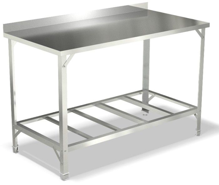 1500х700х850мм, Стол производственный с бортом высотой 40 мм, столешница из нержавеющей стали AISI 430 толщиной 0,5 мм с подложкой ДСП толщиной 16 мм. Каркас из нержавеющей стали AISI 430 толщиной 1,5 мм, полка-решетка из нержавеющей стали AISI 430 толщиной 0,8 мм. Полка стола выдерживает распределенную статическую нагрузку - 20 кг, столешница - 100 кг. Наличие подгибов по периметру столешницы и полки исключает опасность травм.