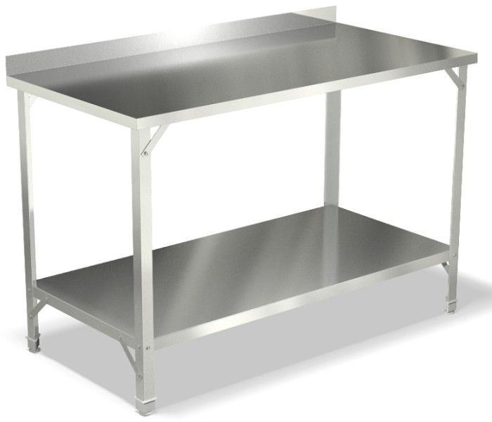1500х700х850мм, Стол производственный с бортом высотой 40 мм, столешница из нержавеющей стали AISI 430 толщиной 0,5 мм с подложкой ДСП толощиной 16 мм. Каркас из нержавеющей стали AISI 430 толщиной 1,5 мм, сплошная полка из нержавеющей стали AISI 430 толщиной 0,5 мм с усилителем. Полка стола выдерживает распределенную статическую нагрузку - 40 кг, столешница - 100 кг. Наличие подгибов по периметру столешницы и полки исключает опасность травм.
