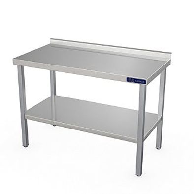1800х700х870мм, нагрузка на столешницу 189кг, 1 борт, столешница нерж. сталь AISI304 0,8мм, подложка столешницы ДСП 16мм, ножки нержавеющая сталь AISI 201, зеркальная, 1,5мм, профиль ножек квадратная труба 40х40мм. Сплошная полка из нержавеющей стали AISI304. Регулируемые ножки 20мм. Вес 49,7кг. Для усиления прочности снизу полки установлен швеллер. Изделие разборное и поставляется в удобной упаковке, что облегчает транспортировку и хранение.
