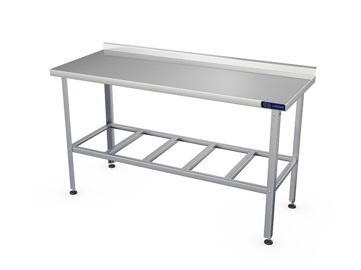 800х600х870мм, нагрузка на столешницу 72кг, 1 борт, столешница нерж. сталь AISI430 0,8мм, подложка столешницы ДСП 16мм, каркас оцинк. сталь 1,2мм, уголок 40х40мм. Полка-решетка из оцинк. стали. Регулируемые ножки 20мм. Вес 15,2кг. Столешница изготовлена из легированной стали. Она укреплена с внутренней стороны листом древесно-стружечной плиты, что увеличивает прочность и исключает прогиб столешницы. Стойки стола выполнены в виде уголка. Стол имеет полку-решётку. Ножки имеют пластиковую опорную часть и регулируются по высоте. Изделие разборное и поставляется в удобной упаковке, что облегчает транспортировку и хранение.