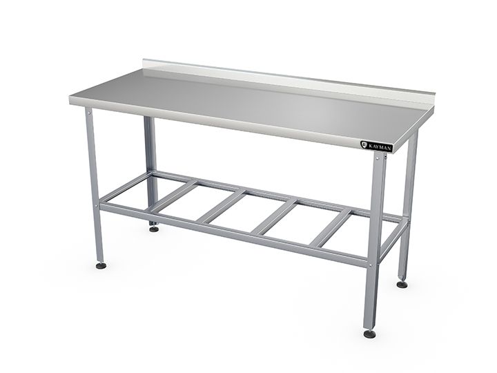 1300х600х870мм, нагрузка на столешницу 156кг, 1 борт, столешница нерж. сталь AISI430 0,8мм, подложка столешницы ДСП 16мм, каркас оцинк. сталь 1,2мм, уголок 40х40мм. Полка-решетка из оцинк. стали. Регулируемые ножки 20мм. Вес 27,3кг. Столешница изготовлена из легированной стали. Она укреплена с внутренней стороны листом древесно-стружечной плиты, что увеличивает прочность и исключает прогиб столешницы. Стойки стола выполнены в виде уголка. Стол имеет полку-решётку. Ножки имеют пластиковую опорную часть и регулируются по высоте. Изделие разборное и поставляется в удобной упаковке, что облегчает транспортировку и хранение.