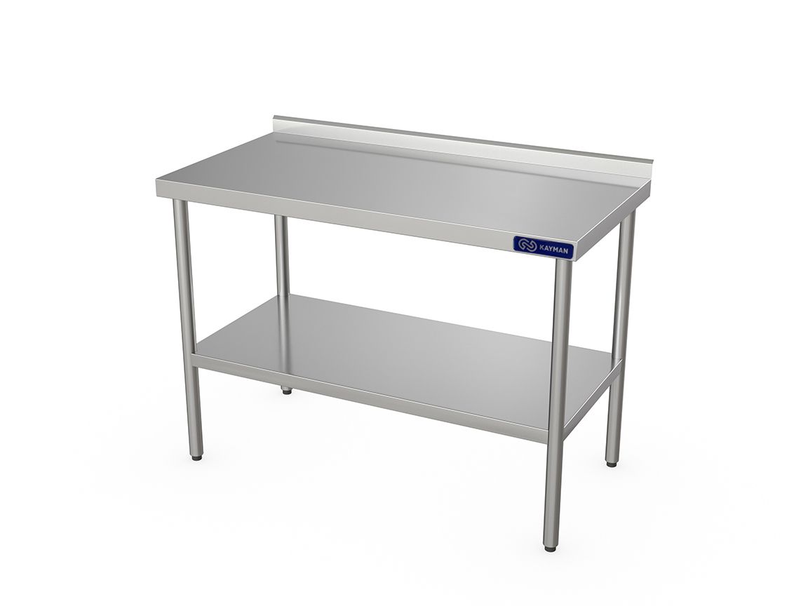 1800х700х870мм, нагрузка на столешницу 189кг, 1 борт, столешница нерж. сталь AISI430 0,8мм, подложка столешницы ДСП 16мм, толщина столешницы – 50 мм. Ножки круглая труба диаметр 40мм, нержавеющая сталь AISI 201, зеркальная, толщина металла 1,5мм. Полка сплошная AISI430. Регулируемые ножки 20мм. Вес 46,9кг. Стойки каркаса с приваренными уголками для крепления столешницы (в верхней части) и уголками для крепления полки на высоте 350 мм от пола (в нижней части). В стойки запрессованы регулируемые по высоте пластиковые ножки, позволяющие изменять высоту стола в пределах 20 мм. Сплошная полка стола выполнена из нержавеющей стали и крепится к уголкам на каркасе. Для усиления прочности снизу полки установлен швеллер. Изделие разборное и поставляется в удобной упаковке, что облегчает транспортировку и хранение.