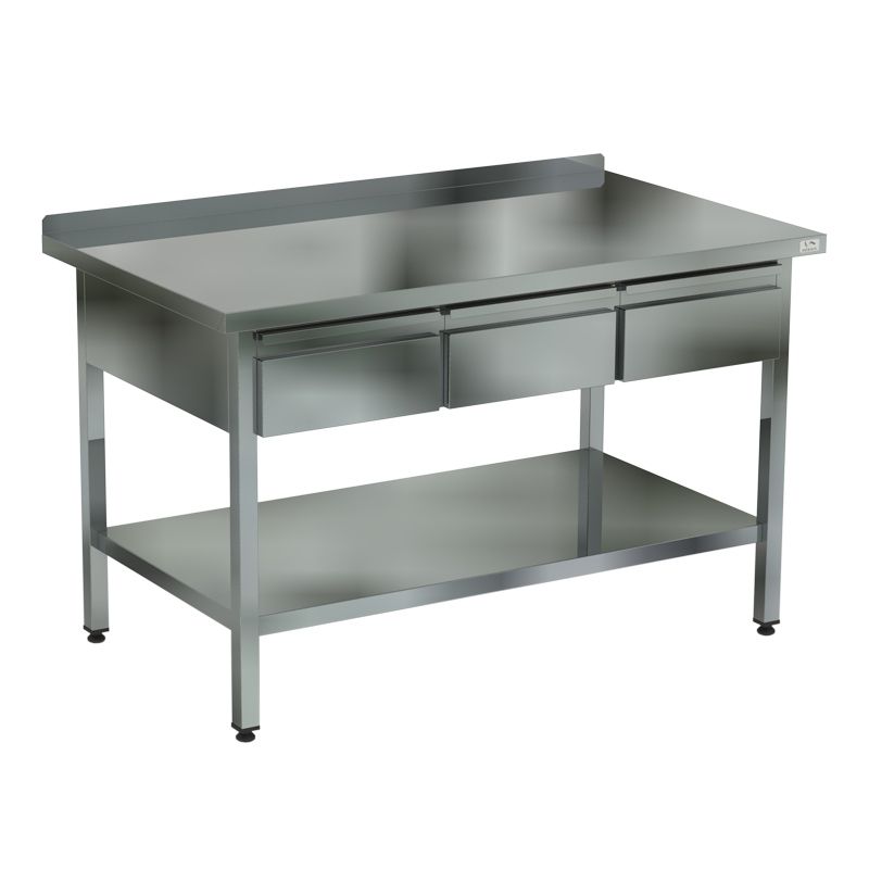 1200х700х870 Стол с выдвижными ящиками (столешница – нерж. сталь aisi 430, борт, выдвижные ящики под столешницей, усиление ОСП, каркас нерж. труба 40х40, разборный) 3 ящика