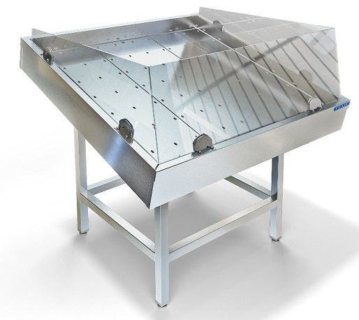 2200х1100х1030мм, Стол для выкладки рыбы на льду с агрегатом, ванна из нержавеющей стали марки AISI 304 толщиной 1мм. Панели обшивки из нержавеющей стали марки AISI 430 толщиной 0,8мм. Сливные трубки диаметром 20 мм 2шт. Внутри ванны перфорированный поддон из нержавеющей стали марки AISI 430 толщиной 0,8мм для аккумулирования холода. Подставка сварная из трубы 40х40 нержавеющей стали марки AISI 304 толщиной 1,2мм. Регулируемые опоры. Агрегат Danfoss, мощность 550 Вт. Стол поставляется в собранном виде.