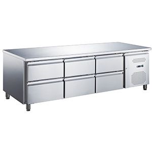1795x700x850мм, 147 кг, 0,23кВт, 230В, 417л, температурный режим -2/+8, динамическое охлаждение, 6 ящиков, столешница из нержавеющей стали, боковое расположение холодильного агрегата, без борта