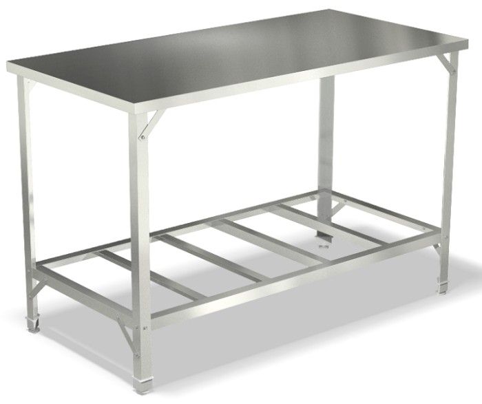 1800х700х850мм, Стол производственный без борта, столешница из нержавеющей стали AISI 430 толщиной 0,5 мм с подложкой ДСП толщиной 16 мм. Каркас из нержавеющей стали AISI 430 толщиной 1,5 мм, полка-решетка из нержавеющей стали AISI 430 толщиной 0,8 мм. Полка стола выдерживает распределенную статическую нагрузку - 20 кг, столешница - 100 кг. Наличие подгибов по периметру столешницы и полки исключает опасность травм.