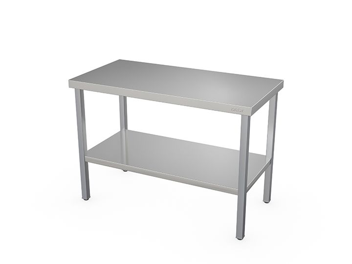 950х800х870мм, нагрузка на столешницу 114кг, без борта, столешница нерж. сталь AISI430 0,8мм, подложка столешницы ДСП 16мм. Ножки нержавеющая сталь AISI 201, зеркальная, толщина металла 1,5мм, квадратная труба 40х40мм. Полка сплошная из нержавеющей стали AISI304. Отсутствие борта позволяет располагать стол в любом месте помещения и осуществлять работу на нем с любой стороны и может быть установлен в центре кухни. Регулируемые ножки 20мм. Вес 31,7кг. Для усиления прочности снизу полки установлен швеллер. Изделие разборное и поставляется в удобной упаковке.