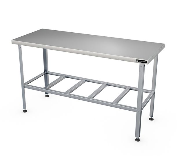 1300 х 600 х 870мм, нагрузка на столешниц 117кг, без борта, столешница нерж. сталь AISI430 0,8мм, подложка столешницы ДСП 16мм. Каркас оцинк. сталь толщина металла 1,2мм, уголок 40х40мм. Полка - решетка из оцинк. стали. Отсутствие борта позволяет располагать стол в любом месте помещения и осуществлять работу на нем с любой стороны и может быть установлен в центре кухни. Регулируемые ножки 20мм. Вес 21,3кг. Изделие разборное и поставляется в удобной упаковке.