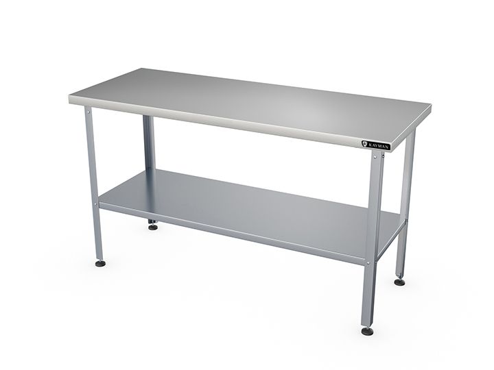 1500х600х870мм, нагрузка на столешниц 135кг, без борта, столешница нерж. сталь AISI430 0,8мм, подложка столешницы ДСП 16мм. Каркас оцинк. сталь толщина металла 1,2мм, уголок 40х40мм. Полка сплошная. Отсутствие борта позволяет располагать стол в любом месте помещения и осуществлять работу на нем с любой стороны и может быть установлен в центре кухни. Регулируемые ножки 20мм. Вес 23,9кг. Изделие разборное и поставляется в удобной упаковке.