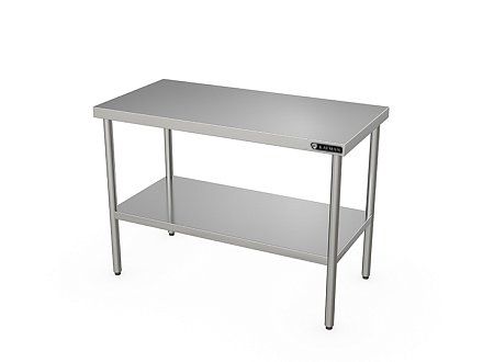 900х700х870 мм, нагрузка на столешниц 94,5кг, без борта, столешница нерж. сталь AISI430 0,8мм, подложка столешницы ДСП 16мм. Ножки нержавеющая сталь AISI 201, зеркальная, толщина металла 1,5мм, круглая труба диаметр 40мм. Полка сплошная из нержавеющей стали AISI430. Отсутствие борта позволяет располагать стол в любом месте помещения и осуществлять работу на нем с любой стороны и может быть установлен в центре кухни. Регулируемые ножки 20мм. Вес 25,6кг. Сплошная полка стола выполнена из нержавеющей стали и крепится к уголкам на каркасе. Для усиления прочности снизу полки установлен швеллер. Изделие разборное и поставляется в удобной упаковке.