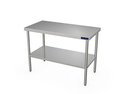 1800х700х870мм, нагрузка на столешниц 189кг, без борта, столешница нерж. сталь AISI430 0,8мм, подложка столешницы ДСП 16мм. Ножки нержавеющая сталь AISI 201, зеркальная, толщина металла 1,5мм, круглая труба диаметр 40мм. Полка сплошная из нержавеющей стали AISI430. Отсутствие борта позволяет располагать стол в любом месте помещения и осуществлять работу на нем с любой стороны и может быть установлен в центре кухни. Регулируемые ножки 20мм. Вес 46,2кг. Сплошная полка стола выполнена из нержавеющей стали и крепится к уголкам на каркасе. Для усиления прочности снизу полки установлен швеллер. Изделие разборное и поставляется в удобной упаковке.