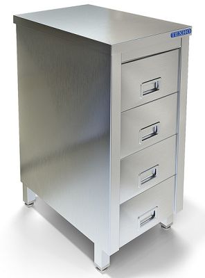 700х700х850мм, Стол-тумба без борта. Столешница из нержавеющей стали марки AISI 430 толщиной 0,8мм, ЛДСП толщиной 32 мм. Корпус и четыре выдвижных ящика из нержавеющей стали марки AISI 430 толщиной 0,8мм. Задняя стенка из оцинкованной стали толщиной 0,55мм. Регулируемые опоры. Стол поставляется в собранном виде.