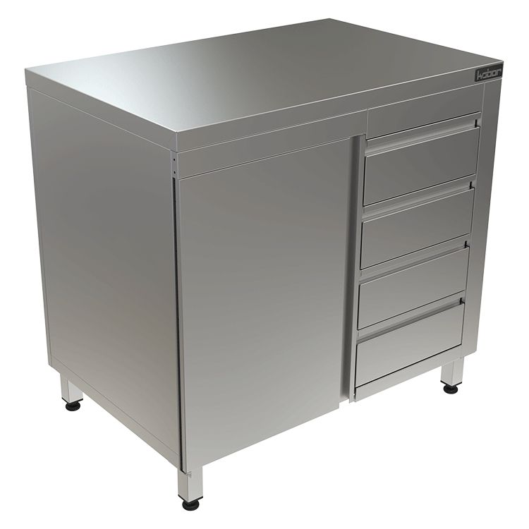 1000х600х870мм, Стол-тумба (столешница - нерж. сталь. aisi 430, усиление ЛДСП, каркас разборный из нерж. стали 430, распашные двери, 4 выдвижных ящика, полка), Ящики могут устанавливаться слева либо справа