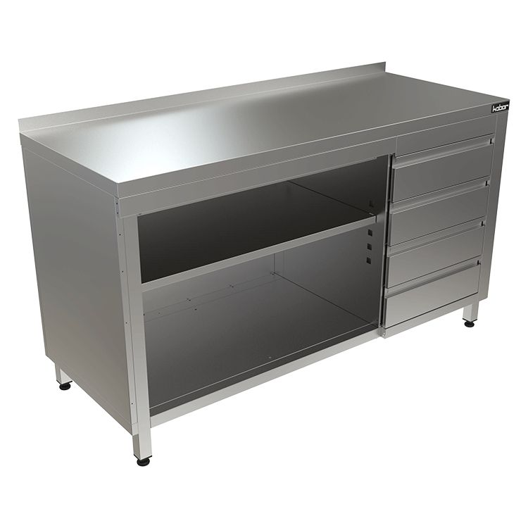 1200х600х870мм, Стол-тумба с бортом (столешница - нерж. сталь. aisi 430, усиление ЛДСП, каркас разборный из нерж. стали 430, распашные двери, 4 выдвижных ящика, полка), Ящики могут устанавливаться слева либо справа