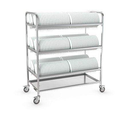 1200х600х1440мм, кол-во уровней 3шт., количество тарелок на двух уровнях 246шт. Расстояние между уровнями 400мм, нагрузка общая 120кг. Материал кассеты, пруток AISI304. Материал поддон AISI304 0,8мм. Материал стоек AISI 304 труба 25х25мм, 2шт. опоры без тормоза, 2шт. опора с тормозом, диаметр поворотных колес 100мм.Вес 41кг. Кассеты съемные, что облегчает их санитарную обработку. Они имеют элементы жесткой фиксации, предотвращающие выпадение кассет во время передвижения тележки. Под кассетой размещен нержавеющий поддон с отверстием для стока воды и небольшим уклоном в сторону этого отверстия. Вода стекает на специальный нержавеющий поддон, приваренный в нижней части тележки. Сварная конструкция.
