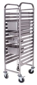 380х550х1735мм, 15 направляющих под гастроемкости GN1/1, сталь 201, толщина 0,8мм, 4 колёса 5" (2 колеса со стопором), не предназначена для использования внутри камер ротационных печей или камер шоковой заморозки, макс. суммарная загрузка 50 кг, расстояние между уровнями 80мм