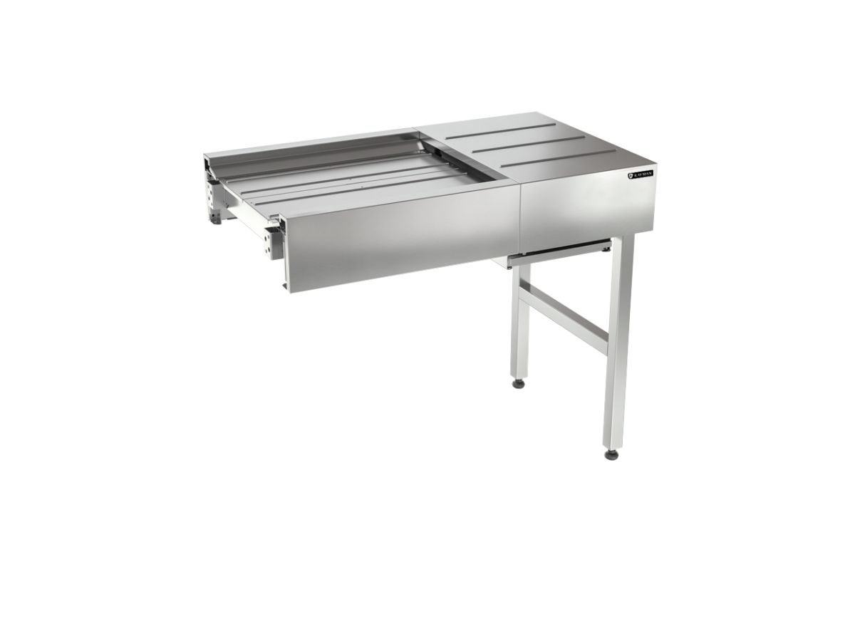 1030х600х850мм, ширина используемой ленты 450мм. Натяжной модуль представляет собой часть транспортера, предназначенную для натяжения ленты. Максимальная длина транспортера – до 20 метров. Перемещение посуды может осуществляться как поштучно, так и на подносах.