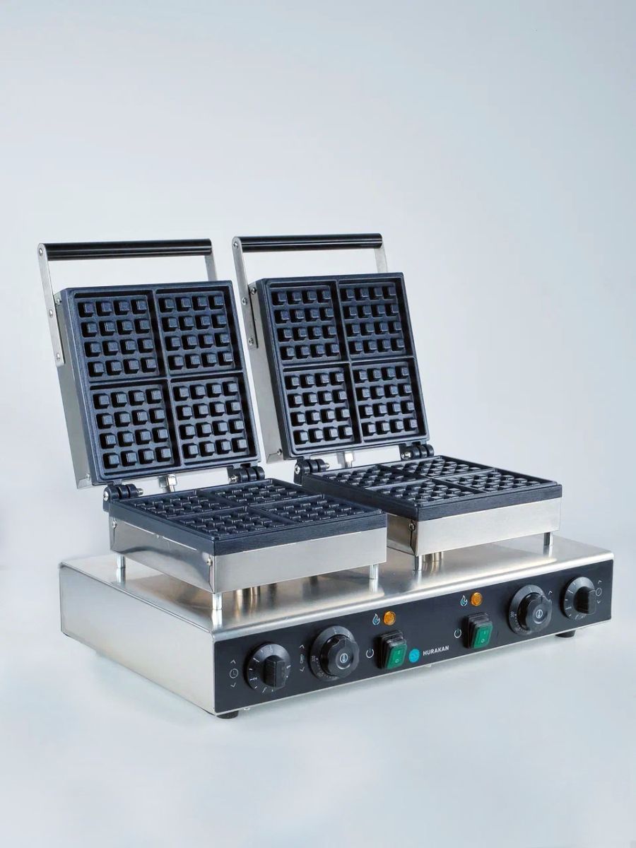 630x380x250мм, 3,2кВт, 220В, 20,5 кг, двойная, для изготовления 8 бельгийских вафель (2 рабочие поверхности для 4 вафель каждая - 4х4 ячейки), размер одной вафли 100x100x15мм, материал корпуса: нержавеющая сталь, материал жарочной поверхности: литой алюминий с антипригарным покрытием, макс температрура нагрева 300С, шаг 50С, 2 таймера без звукового сигнала,