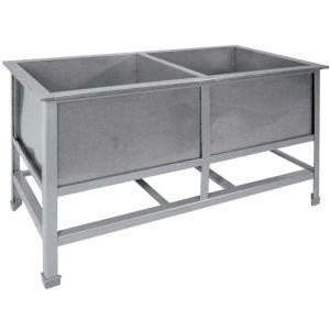 1000х530х850мм, Две сварные емкости размером 430х430х300 из нержавещей стали марки AISI 304 толщиной 0,8мм. Каркас сварной из уголка 40х40 толщиной 2мм, покрытого порошковой краской серого цвета, внизу по периметру обвязка. Ванна комплектуется выпуском с нержавеющей решеткой и механическим запорным клапаном, диаметр выпуска 90мм, диаметр подключаемого сифона 50мм, регулируемые опоры. На дне ванны ребра (лучи) для жесткости и снижения вибрации. Ванна поставляется в собранном виде.
