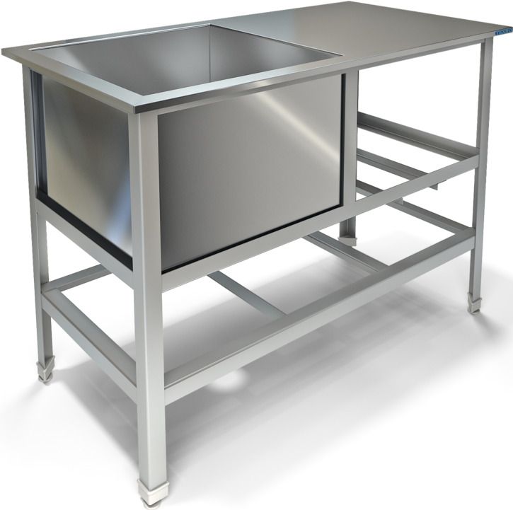 1200х600х850мм, Одна сварная емкость размером 530х500х400 из нержавеющей стали марки AISI 304 толщиной 0,8мм, крыло. Каркас сварной из уголка 40х40 нержавеющей стали марки AISI 430 толщиной 2мм, внизу по периметру обвязка. Ванна комплектуется выпуском с нержавеющей решеткой и механическим запорным клапаном, диаметр выпуска 90мм, диаметр подключаемого сифона 50мм, регулируемые опоры. На дне ванны ребра (лучи) для жесткости и снижения вибрации. Ванна поставляется в собранном виде.