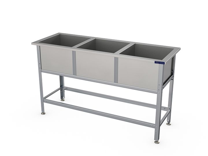 Габариты 1790х630х870 мм, внутренние размеры ванны 530х530х400 мм, сварная, 3 секции, ширина бортов по периметру ванны 50мм, диаметр сливного отверстия 48мм, ванна AISI304 0,8мм, каркас 1,2мм оцинкованная сталь, профиль уголок 40х40мм, регулировка ножек 20мм.Все кромки ванны и элементов каркаса имеют подгиб (фальцовку). В комплект поставки ванны входит система разрыва струи.