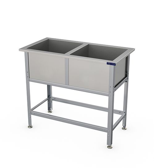 Габариты 1010х530х870мм, внутренние размеры ванны 430х430х300мм, сварная, 2 секции, ширина бортов по периметру ванны 50мм, диаметр сливного отверстия 48мм, нет отверстия под смеситель, ванна AISI430 0,8мм, каркас 1,2мм крашеная углеродистая сталь, профиль уголок 40х40мм, регулировка ножек 20мм.Все кромки ванны и элементов каркаса имеют подгиб (фальцовку). В комплект поставки ванны НЕ входит система разрыва струи.