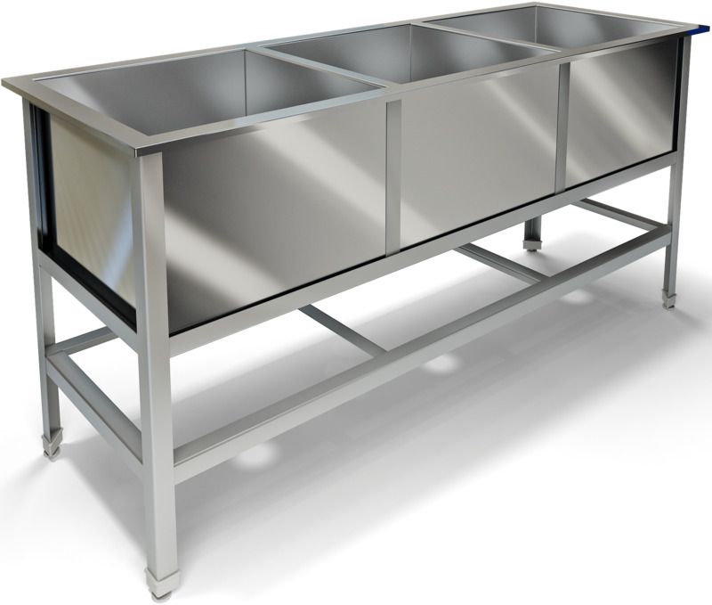 1450х530х850мм, Три сварные емкости размером 430х430х300 из нержавеющей стали марки AISI 304 толщиной 0,8мм, крыло. Каркас сварной из уголка 40х40 нержавеющей стали марки AISI 304 толщиной 2мм, внизу по периметру обвязка. Ванна комплектуется выпуском с нержавеющей решеткой и механическим запорным клапаном, диаметр выпуска 90мм, диаметр подключаемого сифона 50мм, регулируемые опоры. На дне ванны ребра (лучи) для жесткости и снижения вибрации. Ванна поставляется в собранном виде.