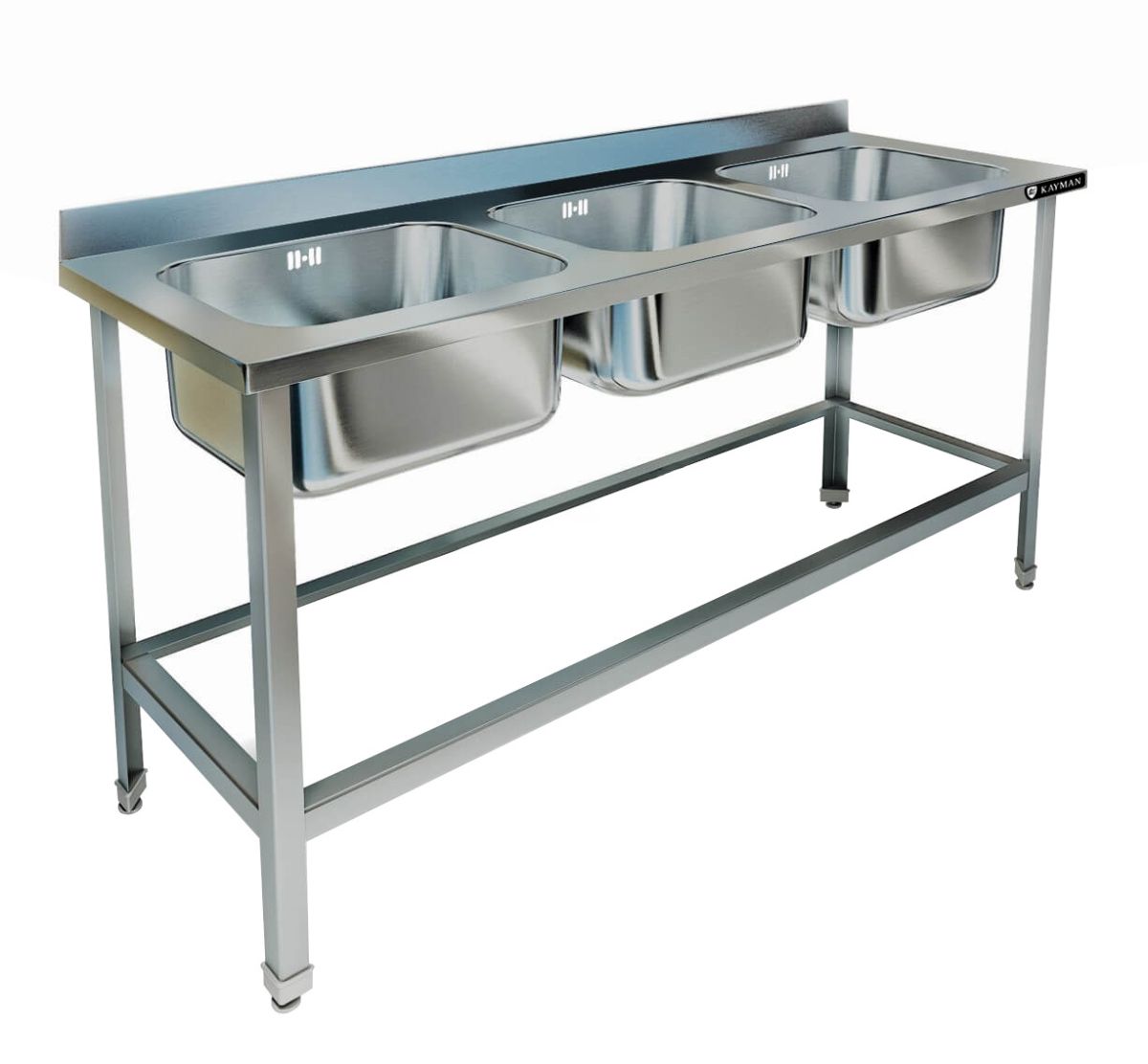 1800х700х850, ванна цельнотянутая из стали AISI 304 (3 емк.)500х500х300, каркас уголок из нержавеющей стали AISI 430 толщиной 1,5 мм, рабочая поверхность из нержавеющей стали AISI 304, толщиной 1 мм, борт плоский 70 мм, обвязка.