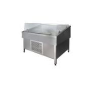 Витрина предназначена для охлаждения и демонстрации рыбы и морепродуктов на льду. Витрина изготавливается с принудительным охлаждением. Изделие выполнено под наклоном, что позволяет покупателю видеть содержимое емкости. Двойные стенки позволяют поддерживать определенную температуру в емкости и замедляют процесс таяния льда, а вмонтированный кран для слива воды позволяет подсоединить ванну напрямую к системе водоотведения. Охлаждение нижней стенки ванны происходит за счет встроенной холодильной системы, позволяющей сохранить как можно дольше лед, который неизбежно тает, контактируя с внешней средой. Все элементы витрины выполнены из нержавеющей стали. Поставляется в собранном виде. Для увеличения рабочего объема внутри витрины и исключения попадания грязи и пыли на продукты, охлаждаемый объем закрыт стеклами. Технические характеристики: Температурный режим: -1...+1°С Мощность: 0,5кВт Статическое охлаждение Напряжение питания: 220В/50Гц Габариты: 1250х1000х690/930