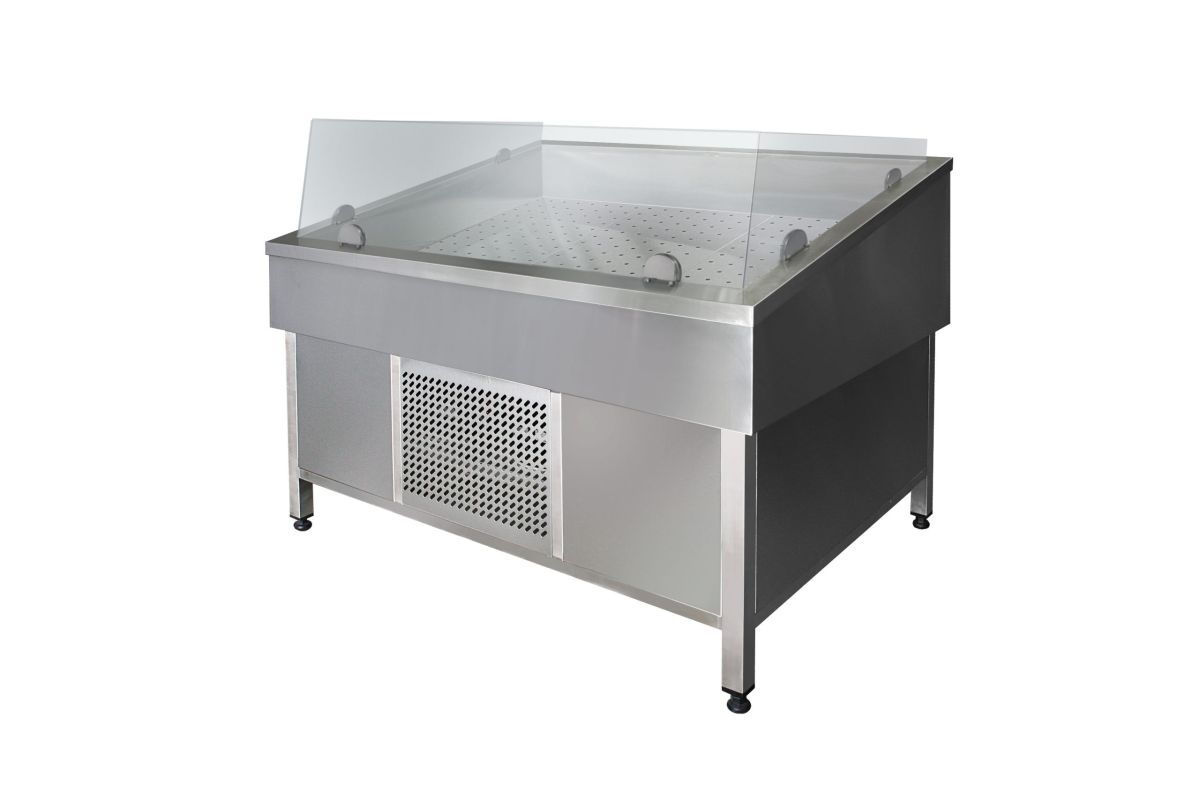 Витрина предназначена для охлаждения и демонстрации рыбы и морепродуктов на льду. Витрина изготавливается с принудительным охлаждением. Изделие выполнено под наклоном, что позволяет покупателю видеть содержимое емкости. Двойные стенки позволяют поддерживать определенную температуру в емкости и замедляют процесс таяния льда, а вмонтированный кран для слива воды позволяет подсоединить ванну напрямую к системе водоотведения. Охлаждение нижней стенки ванны происходит за счет встроенной холодильной системы, позволяющей сохранить как можно дольше лед, который неизбежно тает, контактируя с внешней средой. Все элементы витрины выполнены из нержавеющей стали. Поставляется в собранном виде. Для увеличения рабочего объема внутри витрины и исключения попадания грязи и пыли на продукты, охлаждаемый объем закрыт стеклами. Технические характеристики: Температурный режим: -1...+1°С Мощность: 0,5кВт Статическое охлаждение Напряжение питания: 220В/50Гц Габариты: 1500х1000х690/930