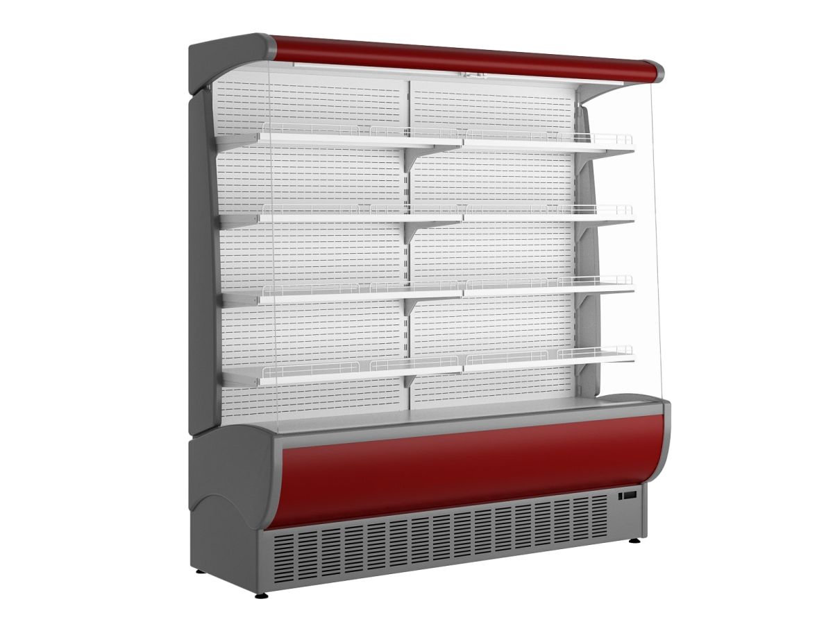 1906х697х2070, t режим +1…+10 C. Витрина холодильная,со встроенным агрегатом, гнутое стекло, 4 металлических полки, полезный объемвыкладки— 1,03 м3,охлаждаемая площадь поддонов для выкладки продуктов 3,68 м2, динамическое охлаждение, оттайка ТЭН, потр. эл.энергии в сутки —20 кВт, R404A, цвет корпуса —белый, фриз и щиток — красный, 14,4Вт, 220В.