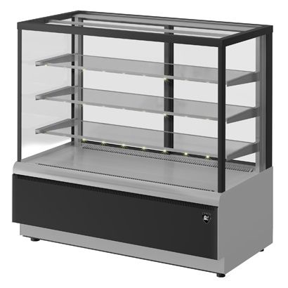 900*700*1280, t режим …0+7 С. Витрина кондитерская, (0…+7С), стеклопакет, 3 стеклянные полки (830х350мм) с LED подсветкой свет тепло-белый, размер выкладки - 868*460мм, вентилируемое охлаждение, раздвижные задние шторки, автоматическая оттайка/ТЭНы, выпариватель, потр. эл.энергии 7кВтч/сутки, вес нетто 140кг, цвет корпуса:серо-черный, 220В, 7кВт/сутки