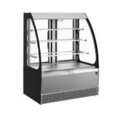 1305х740х1265 t режим 0…+7 C. Витрина холодильная,со встроенным агрегатом, гнутое стекло, 3 стеклянные полки, полезный объем —0,35 м3,охлаждаемая площадь поддонов для выкладки продуктов, 1,8 м2, динамическое охлаждение, раздвижные задние шторки, оттайка естественными теплопритоками, потр. эл.энергии в сутки —10,4кВт, R290, цвет корпуса — черный, экспозиционные поверхности — отделка под золото, 19,2Вт, 220В.