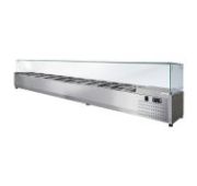 1835х385х265мм, Витрина охлаждаемая настольная открытая, изготовлена из нержавеющей стали марки AISI 430. Температурный режим +2…+7, вместимость: GN 1/3 - 7х150, плюс GN 1/2 - 1х150, мощность 100Вт. Компрессор (Китай). Хладон R-134. Поставляется в собранном виде.