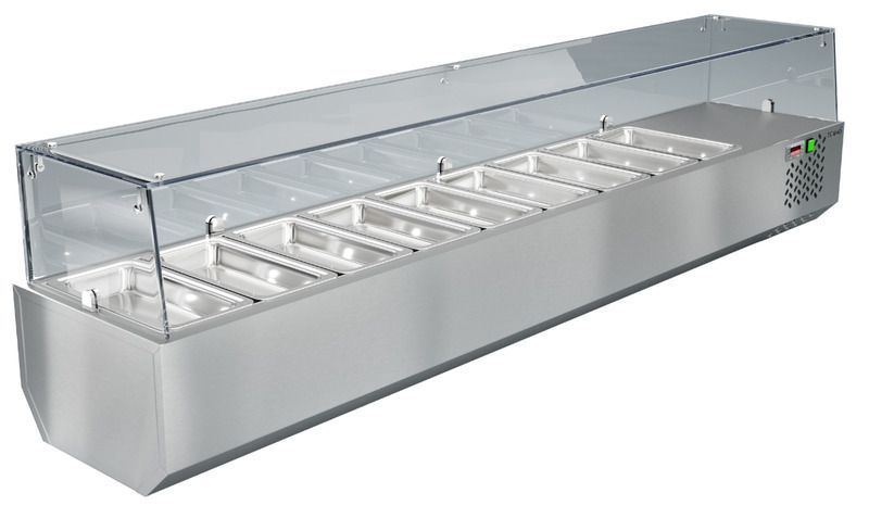 1970х385х480мм, Витрина охлаждаемая настольная со стеклом, изготовлена из нержавеющей стали марки AISI 430. Температурный режим +2…+7, вместимость: GN 1/3 - 9х150, мощность 100Вт. Компрессор (Китай). Хладон R-134. Поставляется в собранном виде.