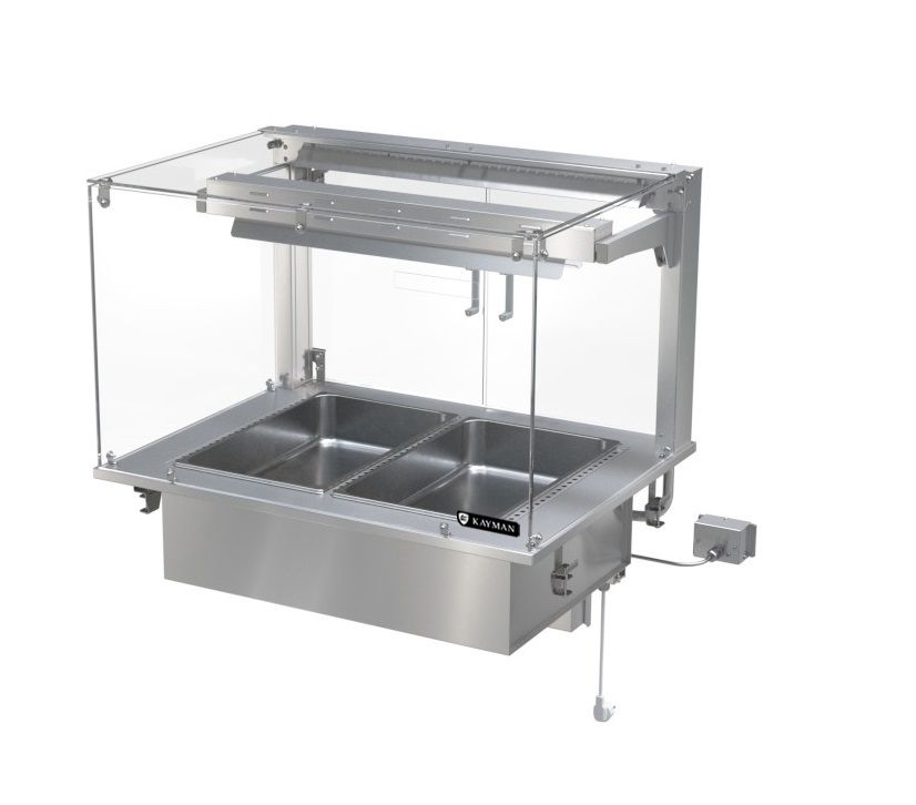 900х700х930мм. Пределы регулирования температуры 20…80С. Тип нагрева-снизу сухой+паровой, сверху ИК-лампа.Тепловая витрина встраиваемая. Каркас витрины из AISI430. Внутри витрины ванна AISI304 для гастроемкостей GN 1/1 150 мм (гастроемкости в комплект поставки не входят и приобретаются отдельно). Корпус витрины выполнен из закаленного стекла. Внутри ванны размещены 3 сухих ТЭНа. Два ТЭНа, расположенные под гастроемкостями, регулируются одним терморегулятором. Третий ТЭН служит для создания паровой бани. Работа данного ТЭНа регулируется отдельным терморегулятором.Предназначена для кратковременного хранения, демонстрации и поддержания в горячем состоянии горячих бутербродов, теплых салатов, пиццы, гарниров, мясных, рыбных и прочих блюд.
