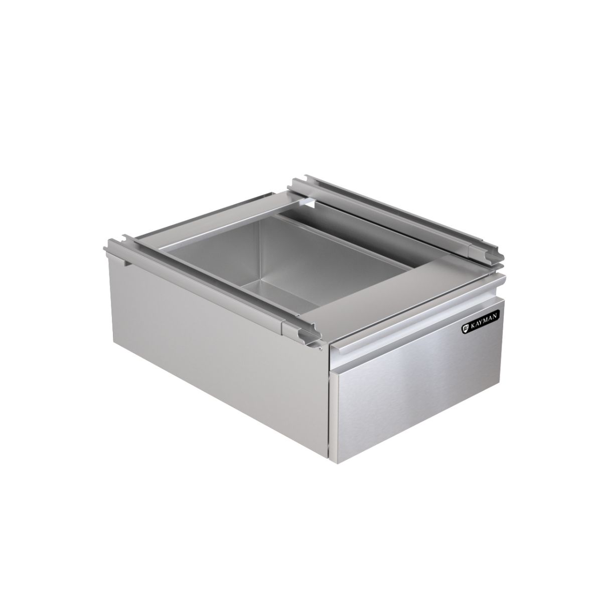 585х453х246мм, материал корпуса и выдвижного ящика AISI430 0,8мм, шариковые направляющие, Возможность крепления ящика в любой части стола. Максимальный вес продукта, уложенного в ящик 7кг. Вес 10,5кг. Ящик предназначен для установки под столешницу столов серии СЦ/СП/СПУ (шириной 600, 700, 800мм). Монтаж осуществляется шурупами к подложке столешницы. В ящик помещается гастроемкость GN1/1 глубиной не более 150мм. Корпус и выдвижной ящик изделия, изготовлены из легированной стали.